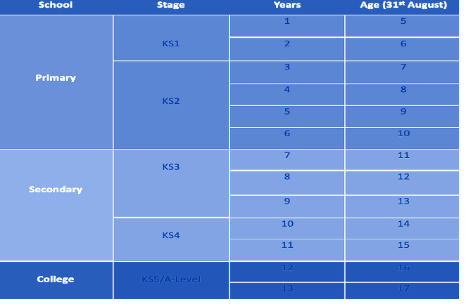 Each class is taught with live-lessons in small groups, weekly, available both during the day and evening. In the UK, students usually start at the age of 5 and enter the first year of school. Primary school is made up of 6 years. Students then follow on to secondary school, which they end with their GCSE exams. Each subject is assessed separately by a series of exams leading to GCSEs or international GCSEs.