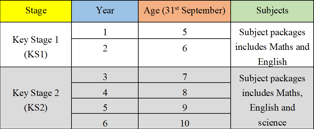 We offer online primary school core subject packages for both Key Stage 1 (KS1), for age 5 to 7 year olds,and Key Stage 2 (KS2) for age 7 to 11 year olds.